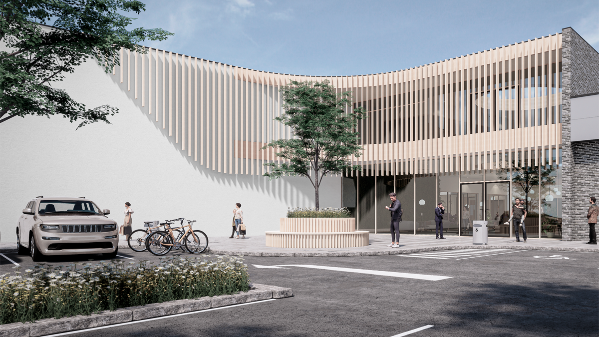 Vi arbejder på at skabe et centerområde, der fremstår som en helhed. Der skal etableres en forbindelse mellem de eksisterende bygninger gennem opførelse af en bygning, der kan huse relevante erhverv.